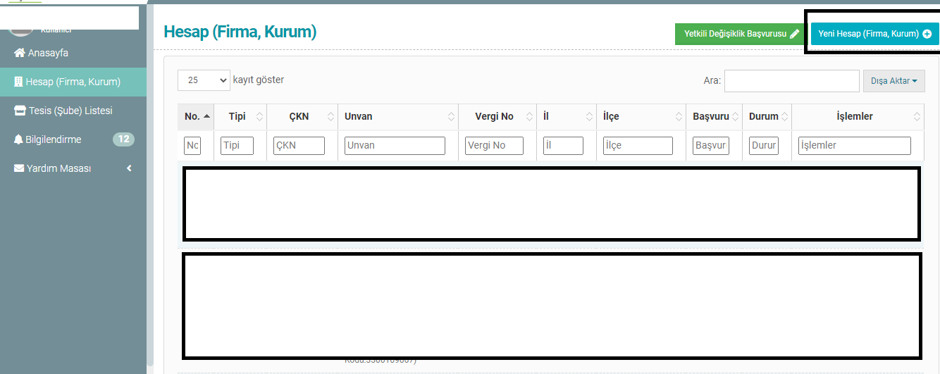 - Sağ üstte bulunan “Yeni Hesap (Firma/Kurum)” butonuna tıklayın.